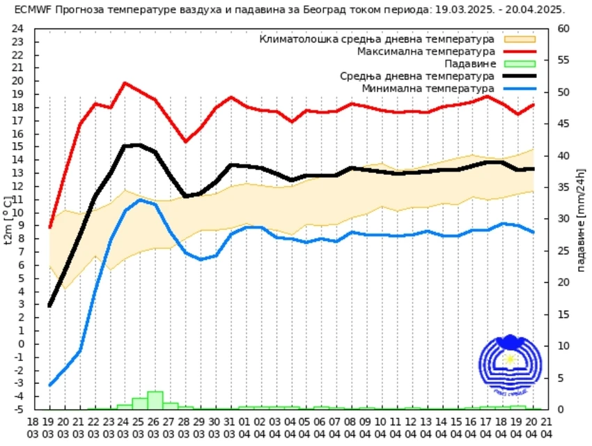Srednja maksimalna temperatura biće iznad proseka, za 0,5 do 1 stepen. U Beogradu i široj okolini srednja maksimalna temperatura vazduha tokom aprila biće oko 19,3 stepeni. Mesečna suma padavina biće u granicama višegodišnjeg proseka sa vrednostima do 5 mm višim u odnosu na višegodišnji prosek. U Beogradu i široj okolini suma padavina biće oko 46 mm.